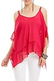 This crepe 2b top features cool stud and beaded detailing on shoulder straps, flowy sleeves and a ruffled asymmetrical hem. Try it with colored denim for a pop. Center back to hem: 18".