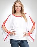 Work a subtle pop of color into your new-season wardrobe with this bebe kimono-style sleeve top, featuring fabric coated button detail at slit sleeves, body-embracing band, and super-soft drape. Team it with leggings for a twist. Center back to hem: 26".