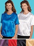 Designed with a classic round neck, this beautiful satin blouse also has short sleeves and a keyhole back. Straight hemline lets you wear it tucked in or out. Perfect paired with pants, skirts, or suits. Imported in machine wash-and-dry polyester.